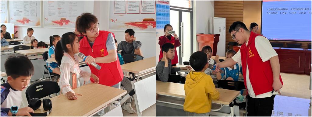 紧接着,宣讲团设计了十个问题进行“陨石知识大比拼”环节。比赛一开始,孩子们就迅速进入状态,面对宣讲员抛出的一道道涵盖陨石成因、类型、结构、特征、撞击效应、科研价值等方面的问题,他们积极举手,争相作答,展现出了高涨的参与热情和强烈的求知欲望。与此同时,在志愿者的带领下,同学们还用粘土亲手制作陨石模型。他们全神贯注地投入到粘土创作之中,他们小心翼翼地揉捏、塑形,将柔软的超轻粘土塑造成形态各异的陨石模型,精细刻画陨石表面的纹理和裂缝,体现出较强的动手操作能力。通过互动环节,同学们不仅锻炼了动手能力、创新思维,还深化了对陨石科学知识的理解。