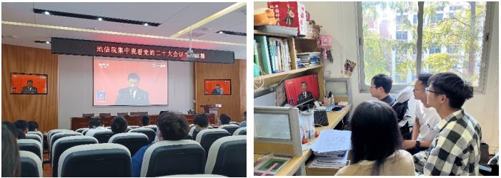 各支部代表在地科楼127报告厅集中观看开幕会;图右:支部党员在办公室进行线上学习)