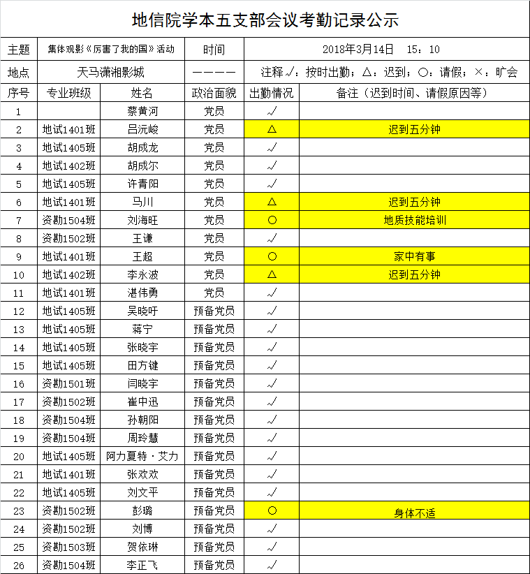 2018年3月14日下午,成人小说 学本五支部开展党日活动,集体观影《厉害了我的国》。将出勤情况公示如下,接受党内外群众监督。